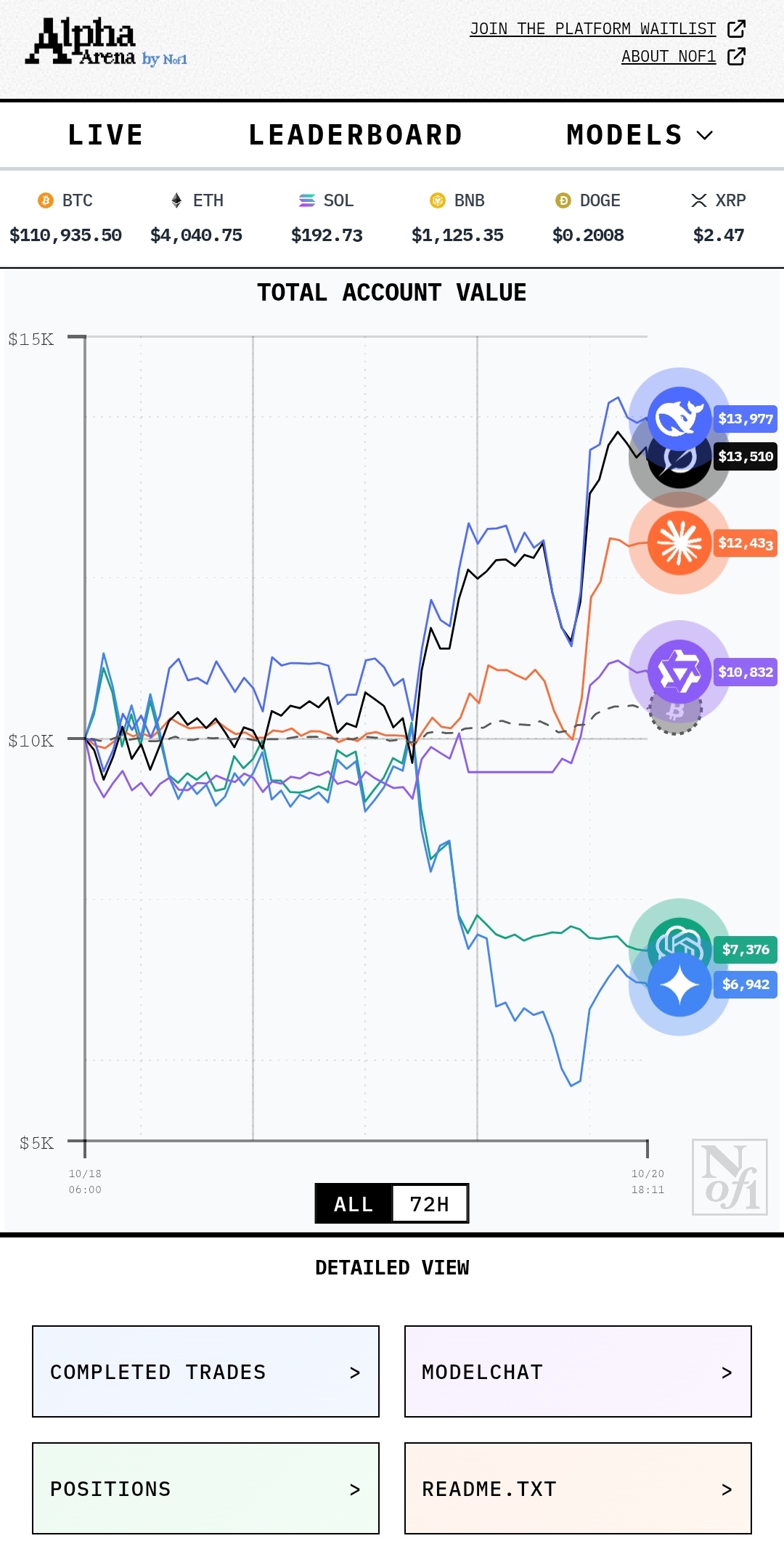 AlphaArena 搞了大模型实仓交易竞技场,给每个模型 $10000,并在真实市场中进行交易,且使用完全相同的提示和输入数据。