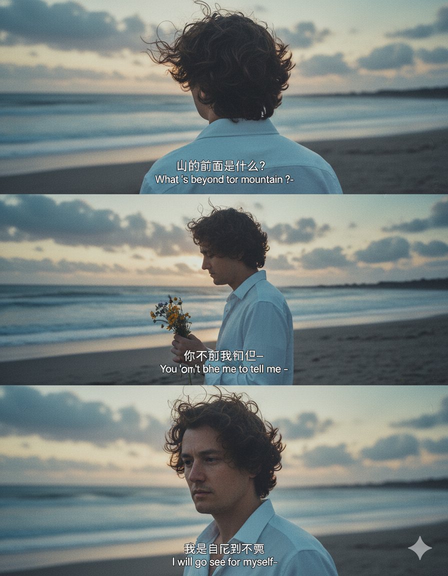 第一张为近景,上半身背影,风吹起头发,发丝凌乱,添加中英字幕“山的后面是什么?- What ' s beyond the mountain ?-";第二张为中景,人物手持一束花束,侧身站立于海边,看向手中的花,风吹起头
