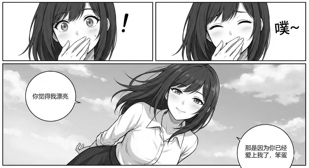 生成一张三格漫画,画面上方三分之一处的左半部分是第一格,右半部分是第二格,画面下方占总画面三分之二的位置是第三格。要求人物长相服装与参考图完全一致。第一格为人物的面部特写,眼睛睁大,眼神中带着一丝惊讶,嘴巴被一只手轻轻捂住,旁边配有一个 “!” 的符号,整体神态呈现出意外、略带羞怯的感觉,动作上是单手掩口,姿态显得较为娇俏。第二格也是人物的面部特写,眼睛眯起,呈现出笑意,嘴巴微张,那只捂住嘴的手还保持着动作,同时有 “噗~” 的拟声词,神态是开心、俏皮的,仿佛是忍不住要笑出声,动作上延续了掩口的姿态,却多了几分活泼的情绪。第三格背景是有云朵的天空,画面只出现了人物的上半身,人物画风与参考图完全一致。人物的发丝被风吹起,眼睛弯弯,面带柔和的笑容,脸颊还有淡淡的红晕。她姿态放松,身体略向前倾,双手背在身后,整体神态是自信且温柔,呈现出一种大方又迷人的状态。第三格左边有圆形对话框,写着“你觉得我漂亮”。右侧下方有圆形对话框,写着“那是因为你已经爱上我了,笨蛋”