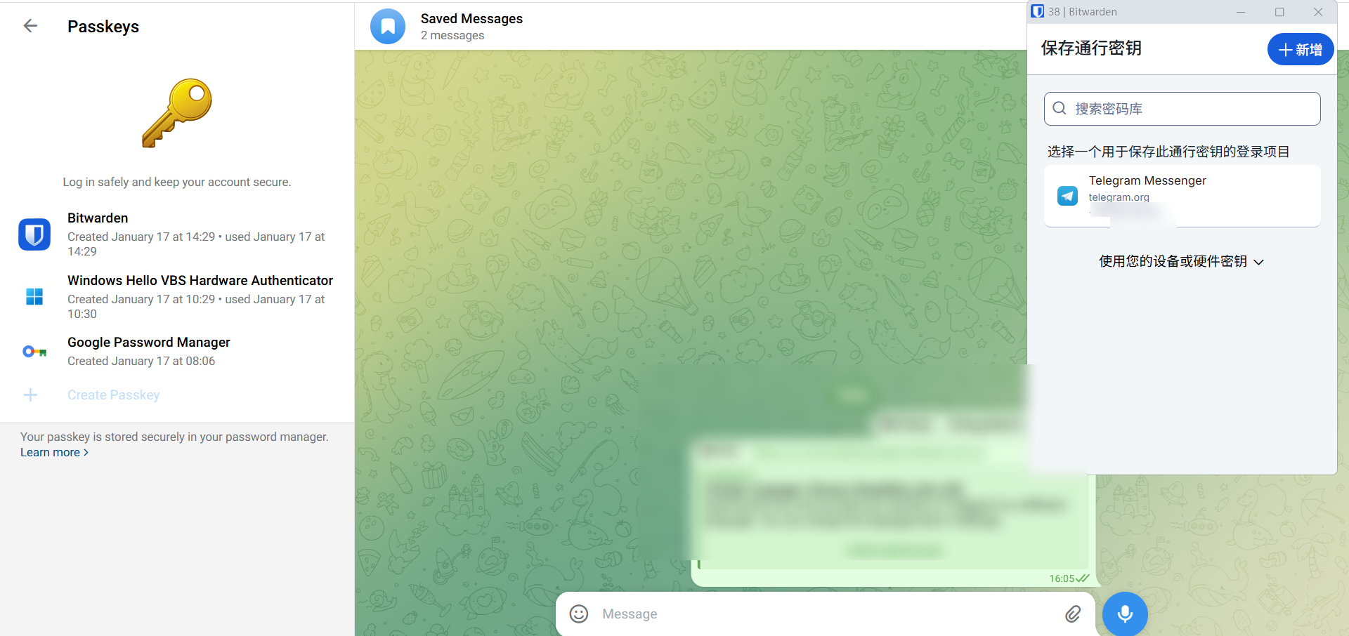 如果说以上你都做不到,那就只剩下浏览器安装Bitwarden扩展,使用网页版的电报来设置通行密钥了。